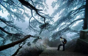 特色: 霧凇非冰非雪,而是由于霧中無數(shù)零攝氏度以下而尚未凝華的水蒸氣隨風在樹枝上不斷積聚凍粘的結(jié)果,表現(xiàn)為白色不透明的粒狀結(jié)構(gòu)沉積物。霧凇形成需要氣溫很低,而且水汽又很充分,同時能具備這兩個形成霧凇的極重要而又相互矛盾的自然條件更是難得。霧松具有“美、媚、柔、透”等特點,極具觀賞性。她全方位、大面積覆蓋,裝點著天柱山的樹木、山峰、巖石、大地。風一吹來,掛著霧凇的樹...